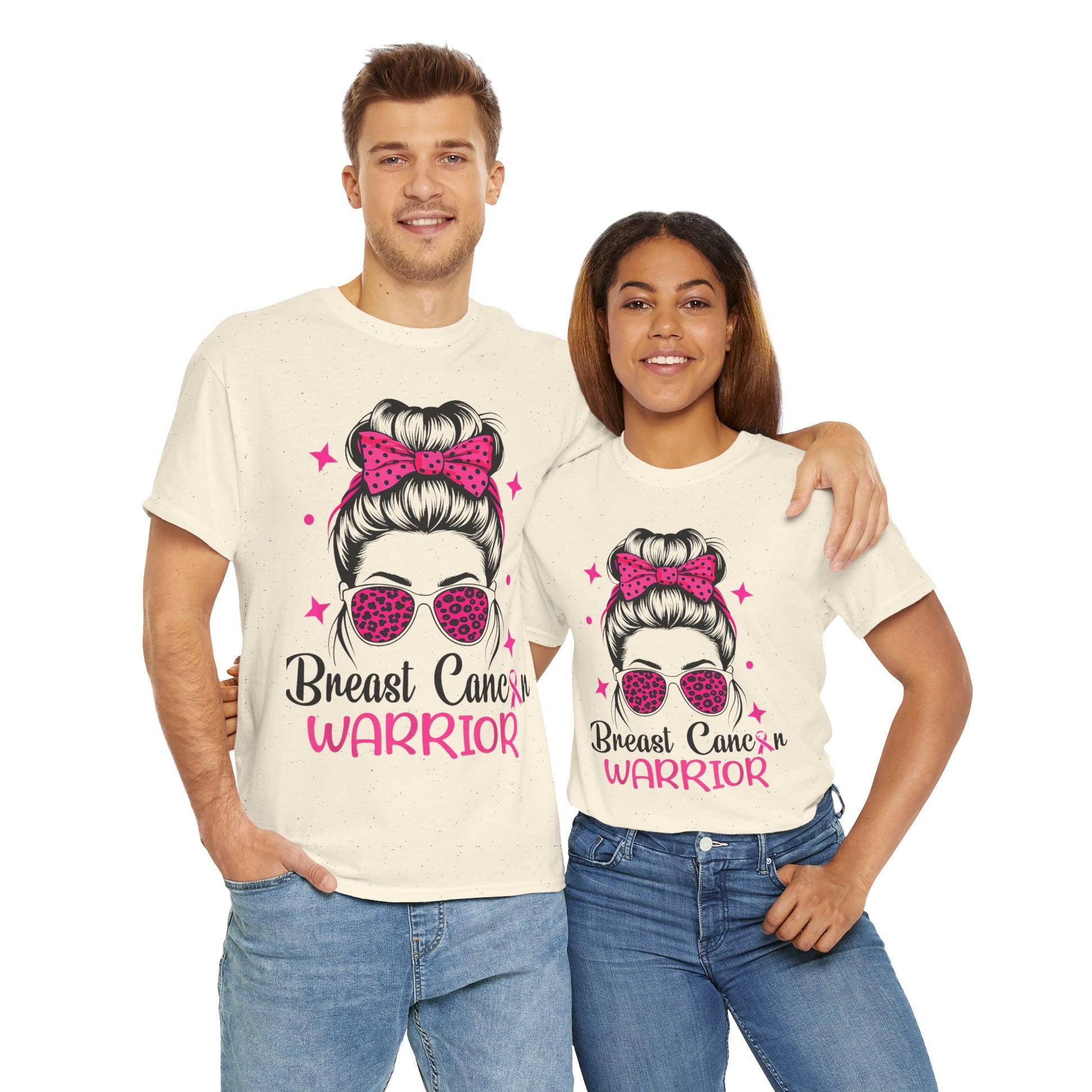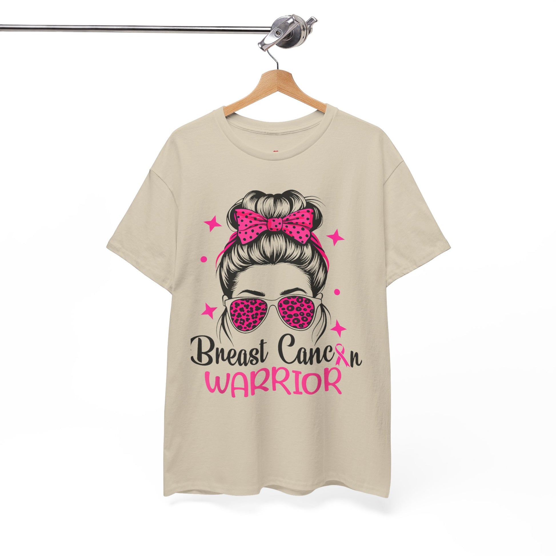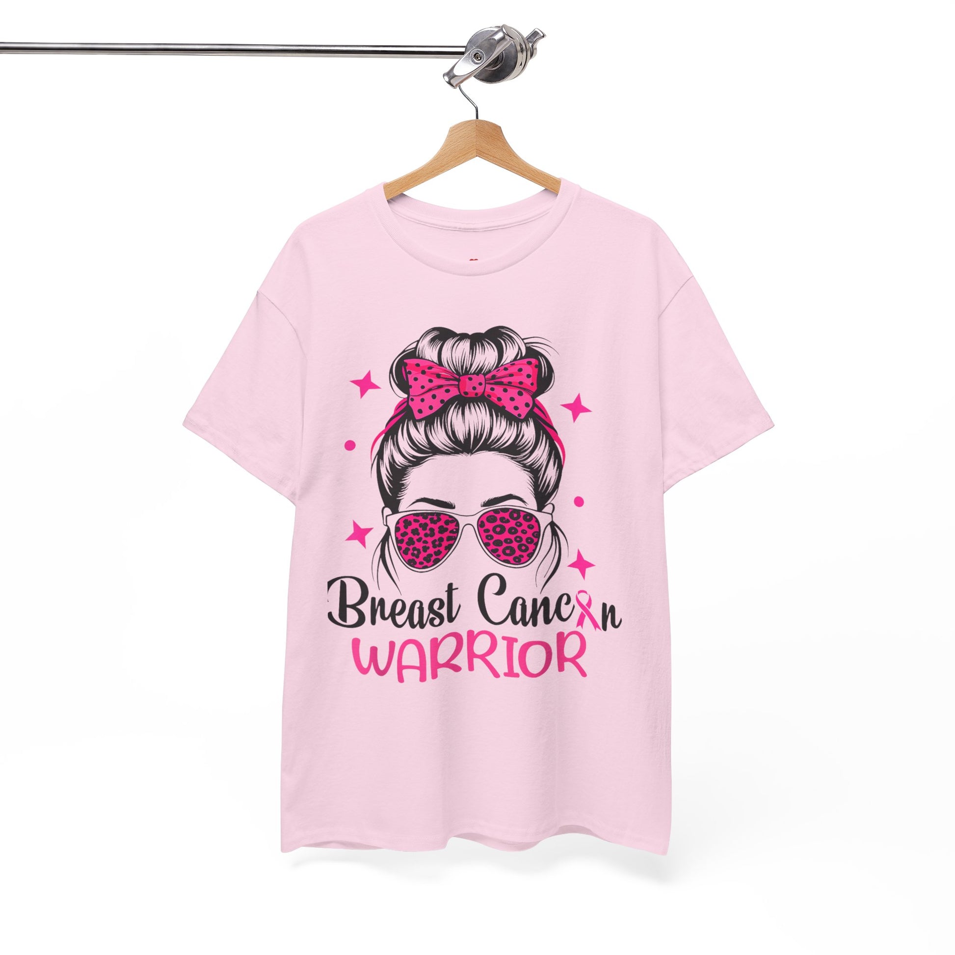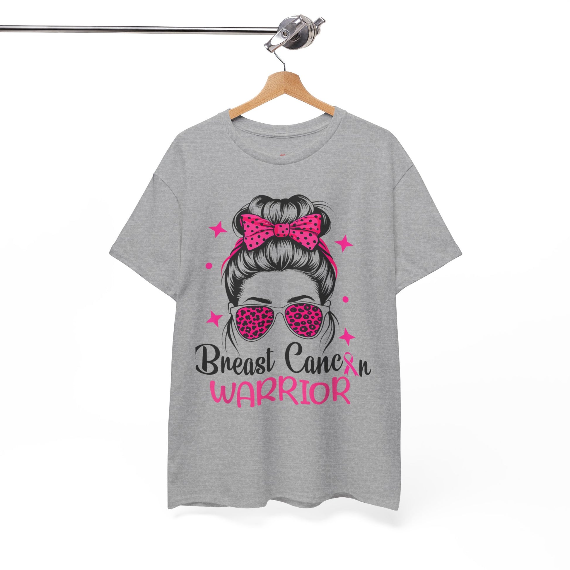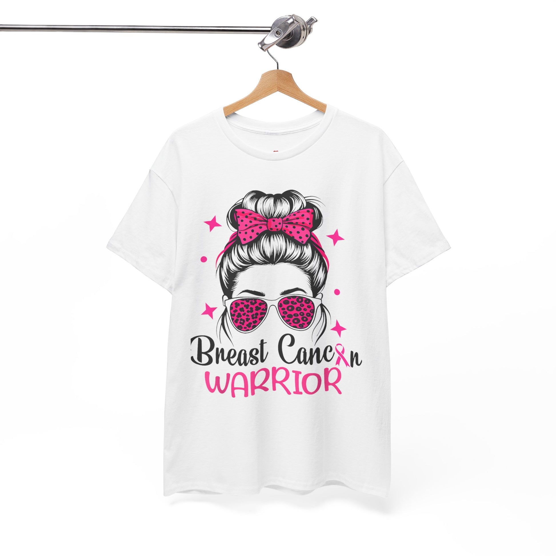 Breast Cancer Warrior awareness tee, perfect for those wanting to show support and raise awareness. This unisex heavy cotton tee offers a classic fit for a comfortable and relaxed wear, suitable for adults. It is made with high-quality fabric for printing, ensuring durability and sustainability. The tee features shoulder tape, ribbed knit collar, and is made in Nicaragua with dual printing techniques for detailed designs.