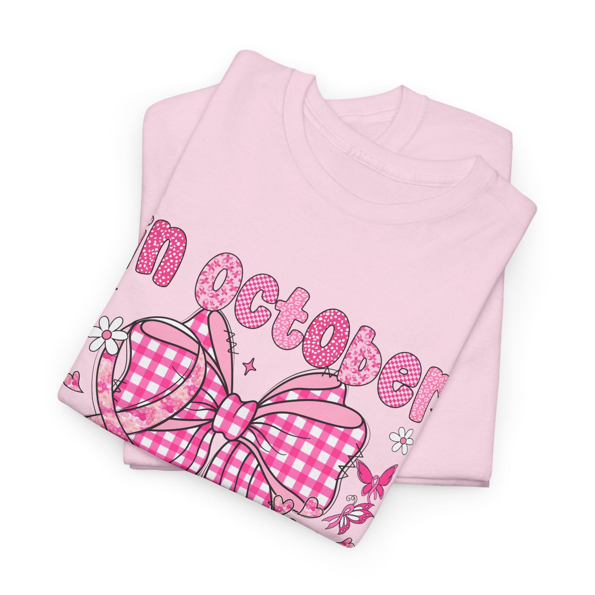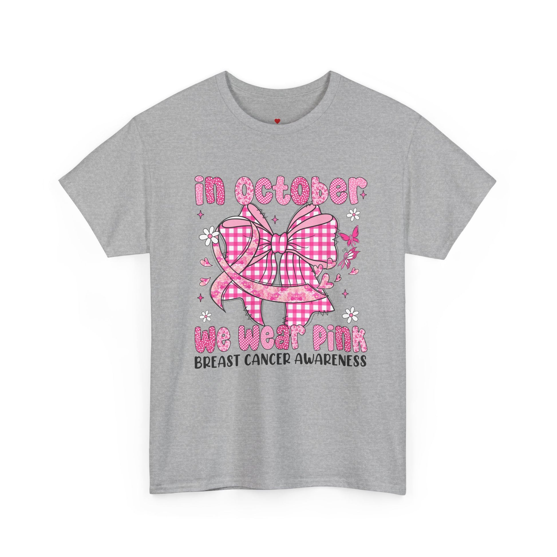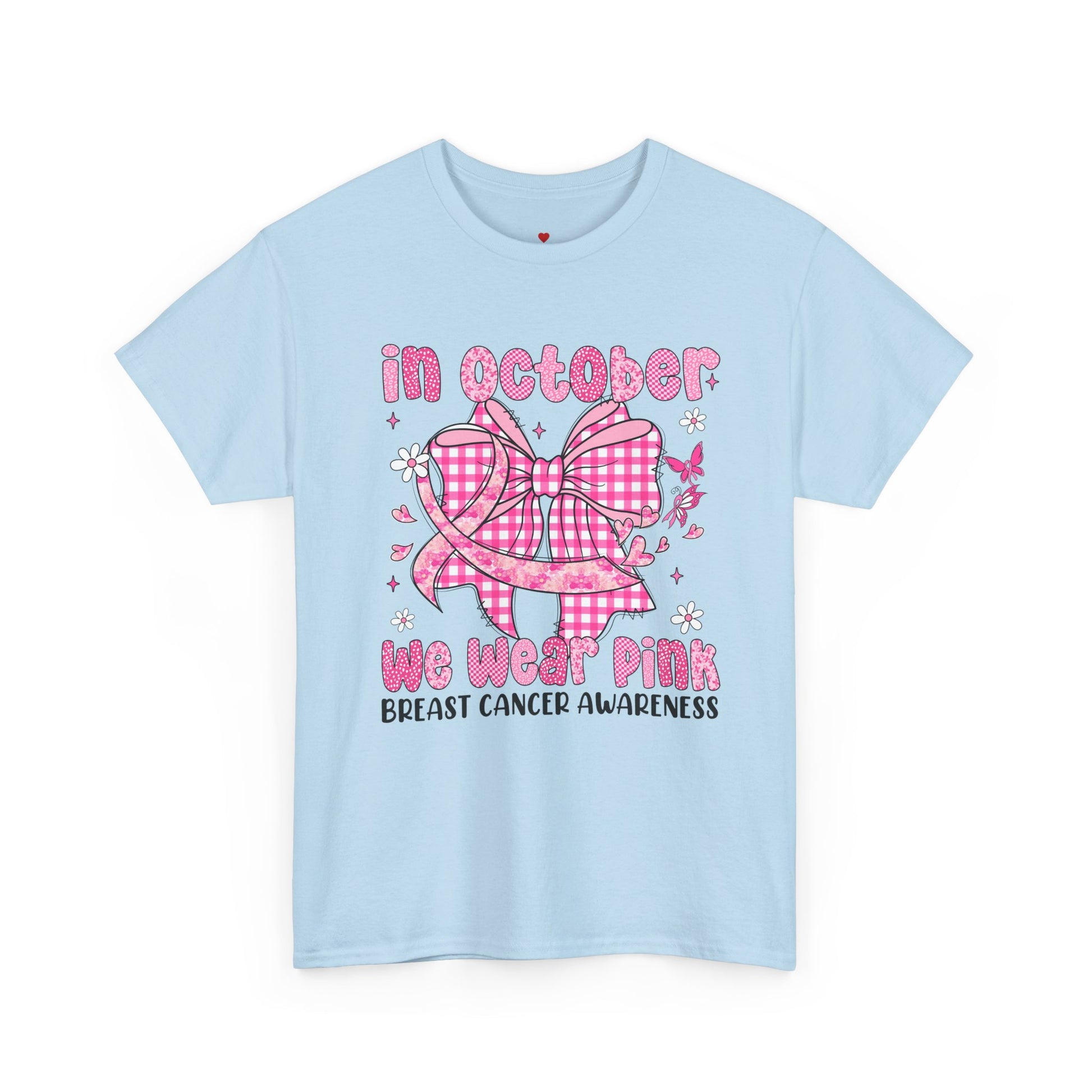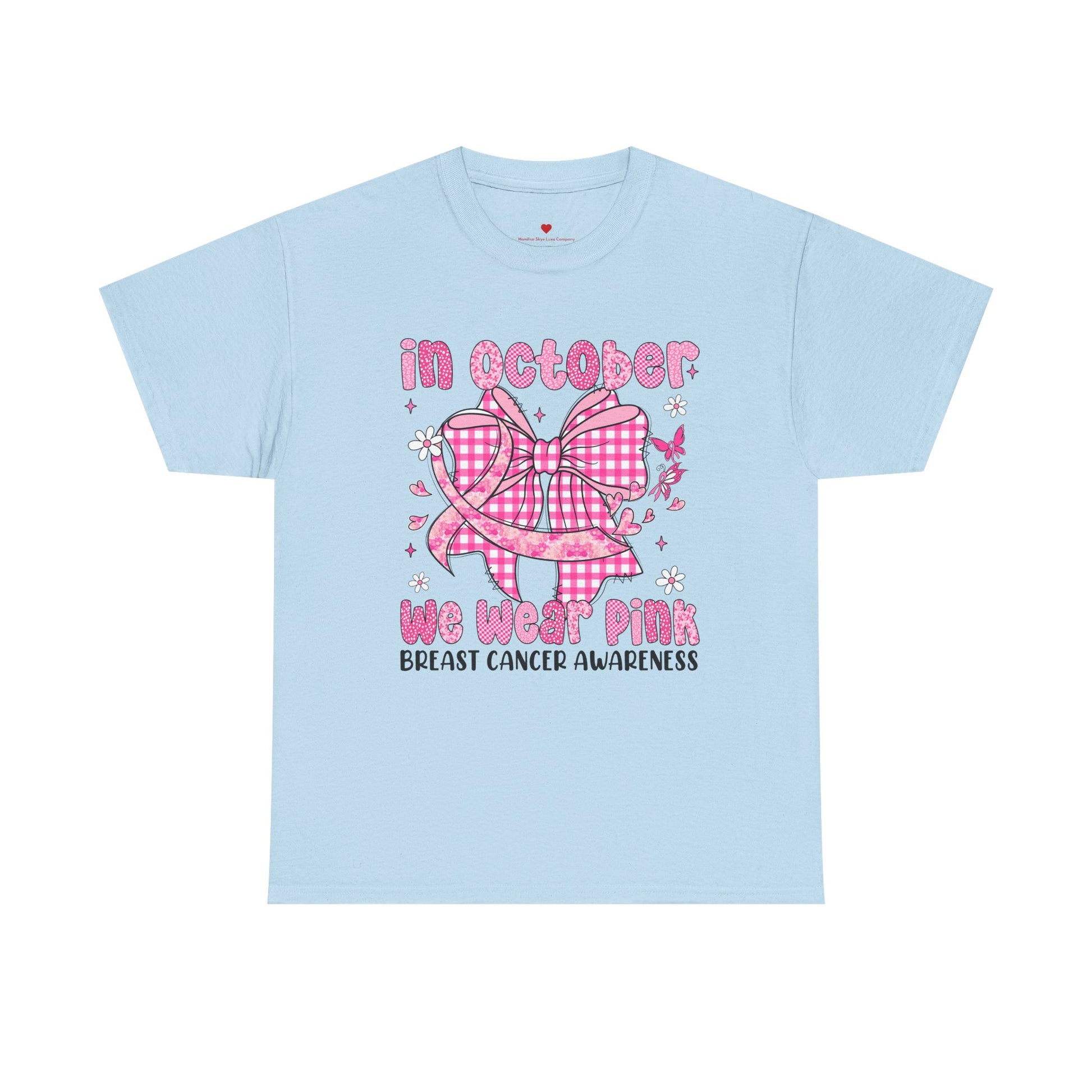 In October We Wear Pink Cancer Awareness tee, perfect for those wanting to show support and raise awareness. This unisex heavy cotton tee offers a classic fit for a comfortable and relaxed wear, suitable for adults. It is made with high-quality fabric for printing, ensuring durability and sustainability. The tee features shoulder tape, ribbed knit collar, and is made in Nicaragua with dual printing techniques for detailed designs.
