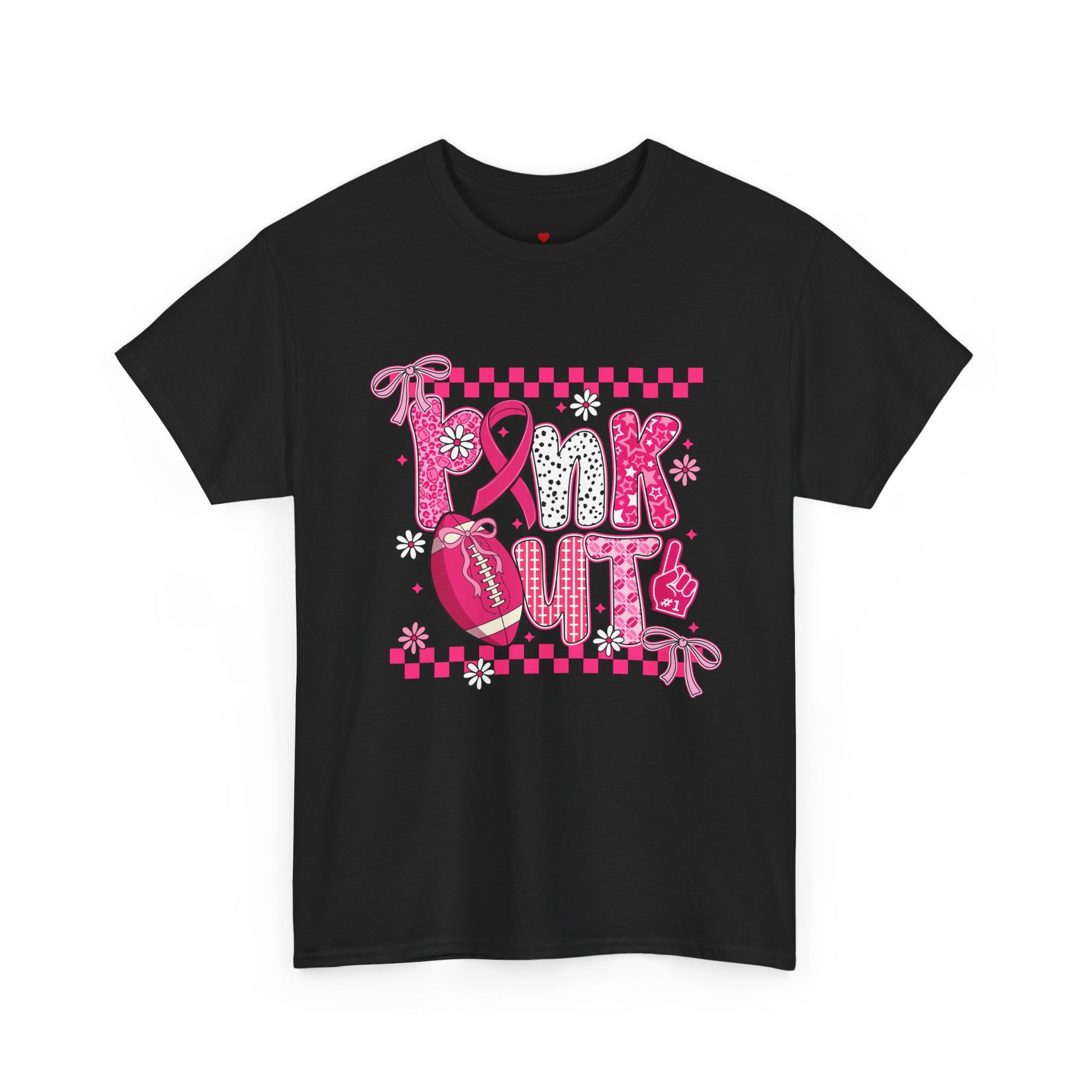 Pink Out Cancer Awareness tee, perfect for those wanting to show support and raise awareness. This unisex heavy cotton tee offers a classic fit for a comfortable and relaxed wear, suitable for adults. It is made with high-quality fabric for printing, ensuring durability and sustainability. The tee features shoulder tape, ribbed knit collar, and is made in Nicaragua with dual printing techniques for detailed designs.