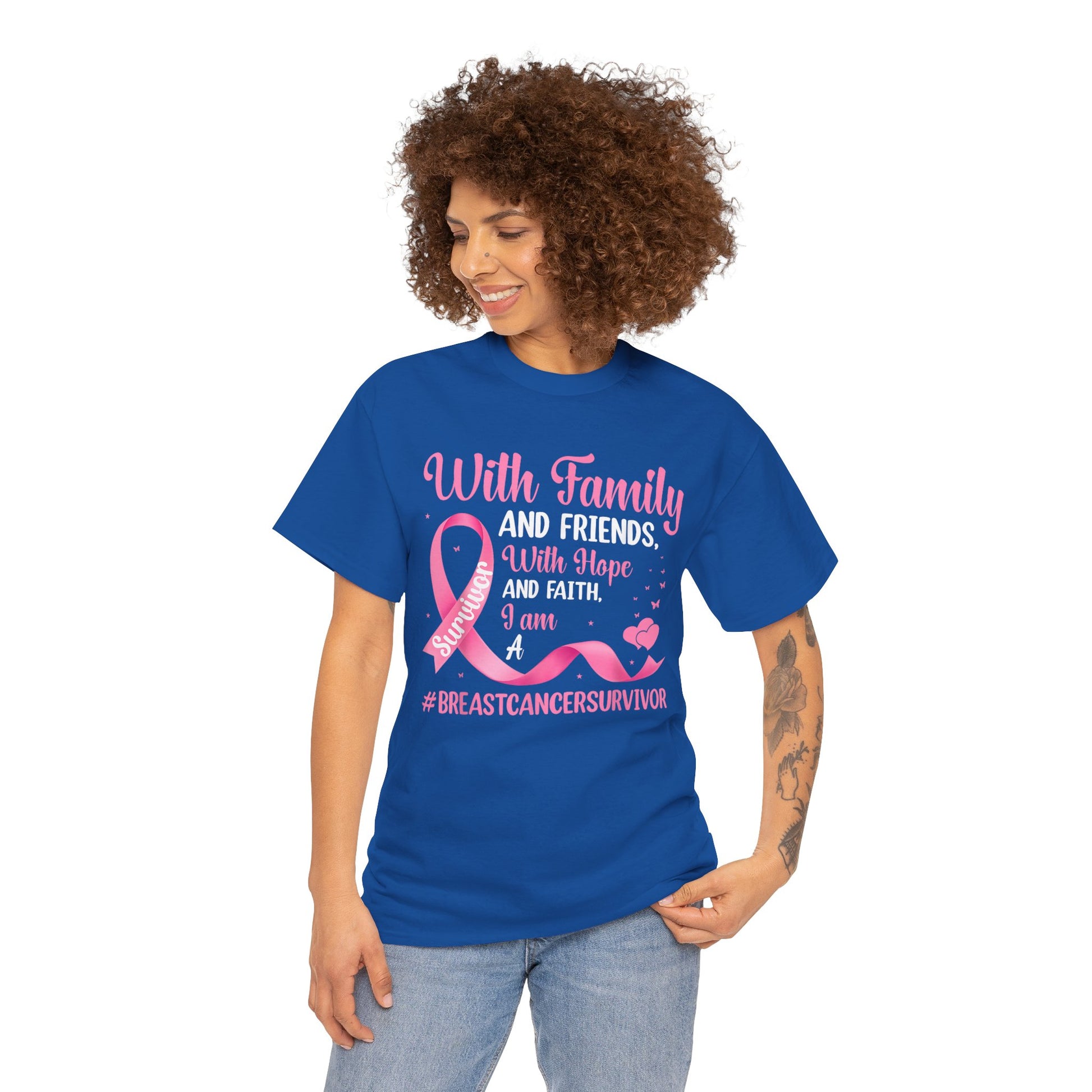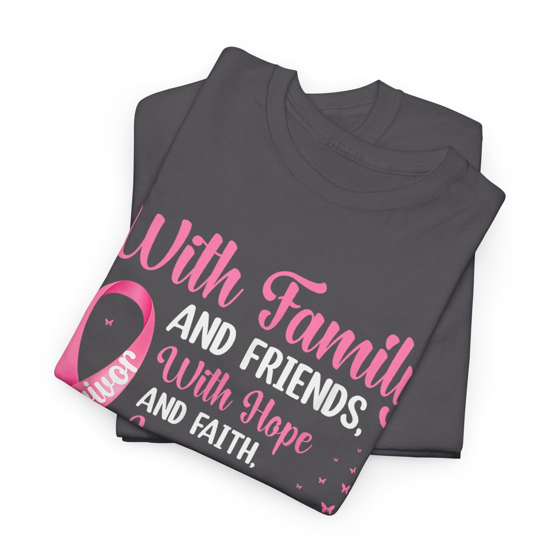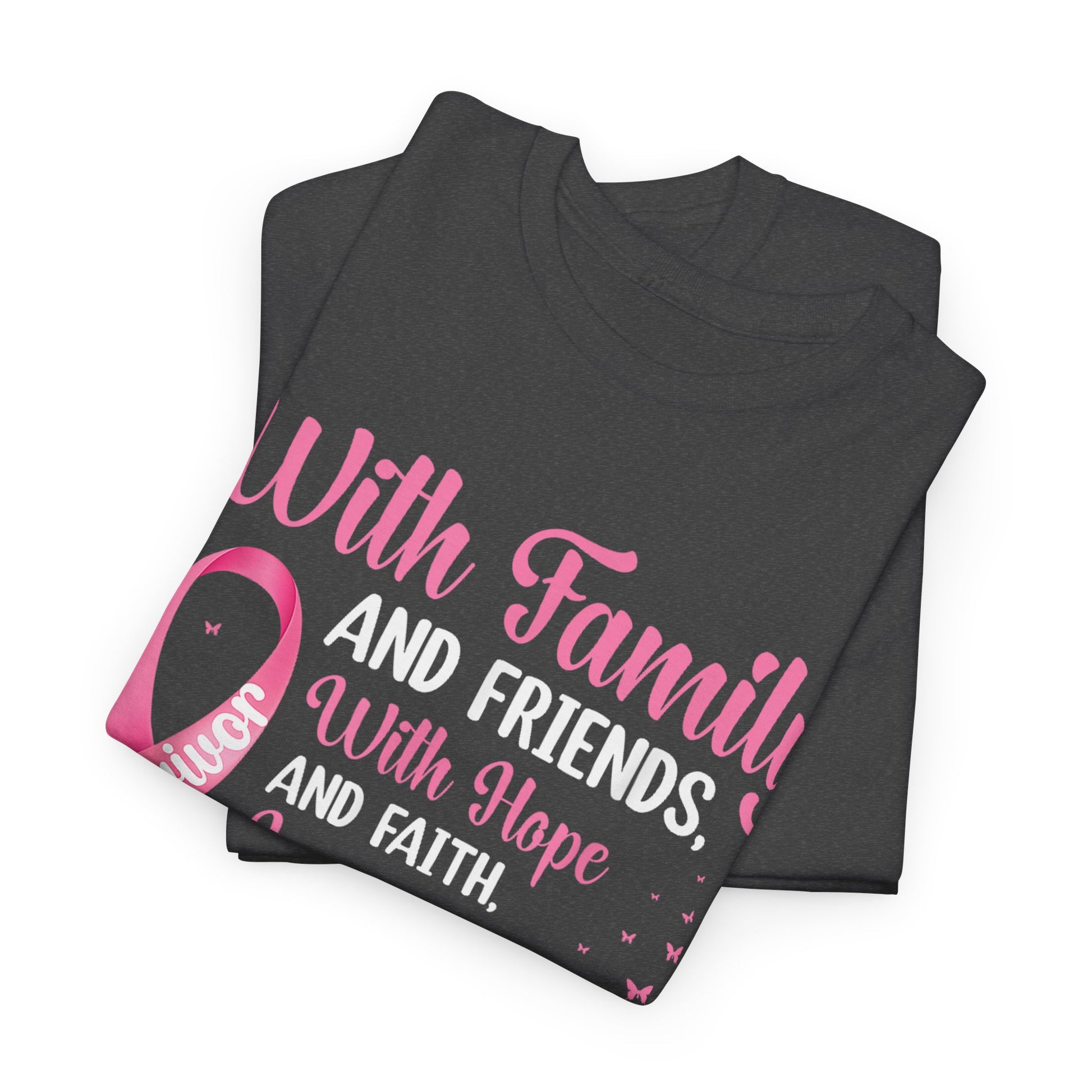 Supportive Family Fighting Together Cancer Awareness tee, perfect for those wanting to show support and raise awareness. This unisex heavy cotton tee offers a classic fit for a comfortable and relaxed wear, suitable for adults. It is made with high-quality fabric for printing, ensuring durability and sustainability. The tee features shoulder tape, ribbed knit collar, and is made in Nicaragua with dual printing techniques for detailed designs.